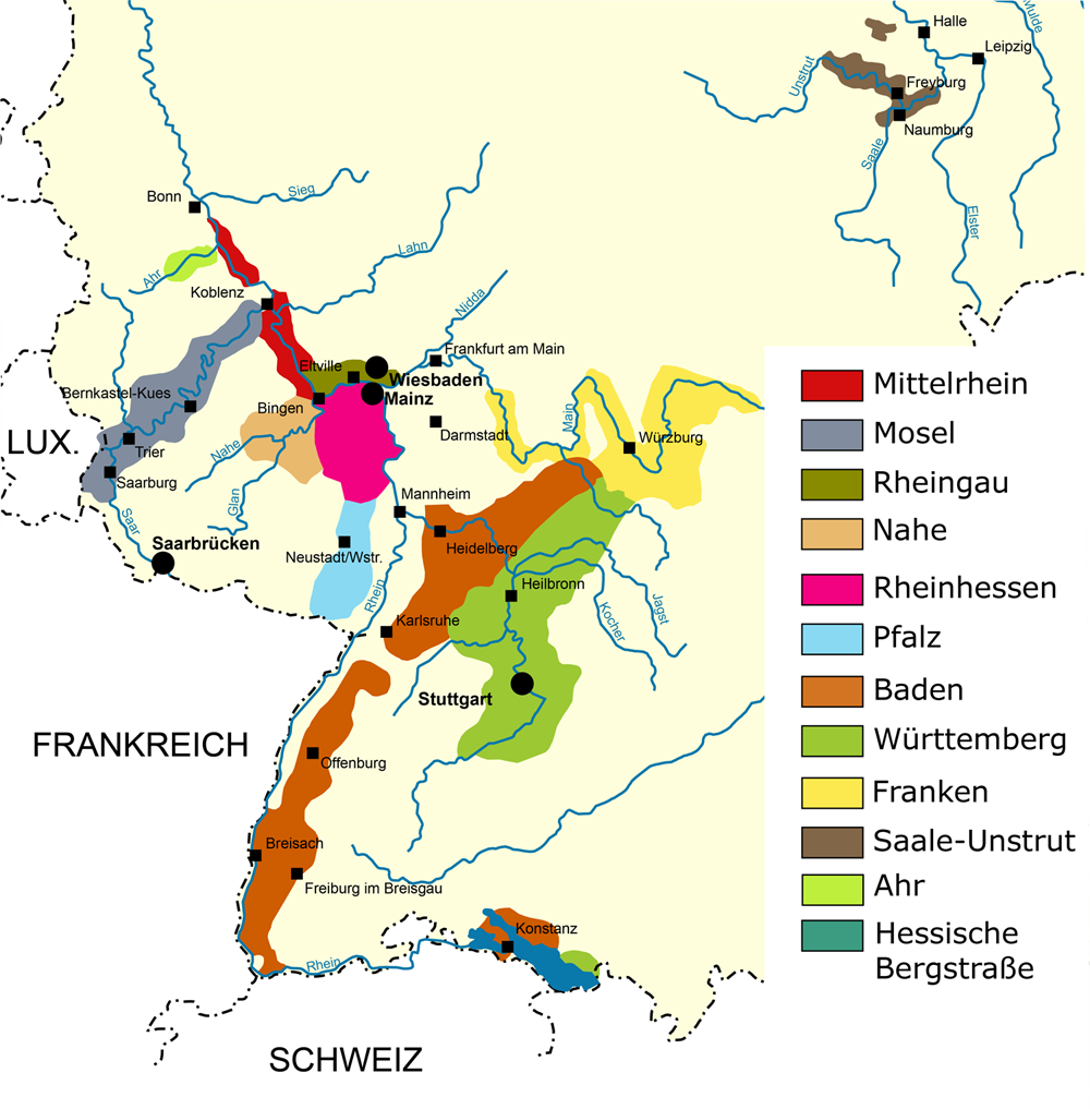 Deutschland verfügt über 13 Anbaugebiete. Mit Ausnahme von Sachsen und Saale-Unstrut konzentrieren sich diese Gebiete im Süden und Südwesten Deutschlands entlang von Rhein, Main, Mosel und Neckar sowie ihrer Nebenflüsse.