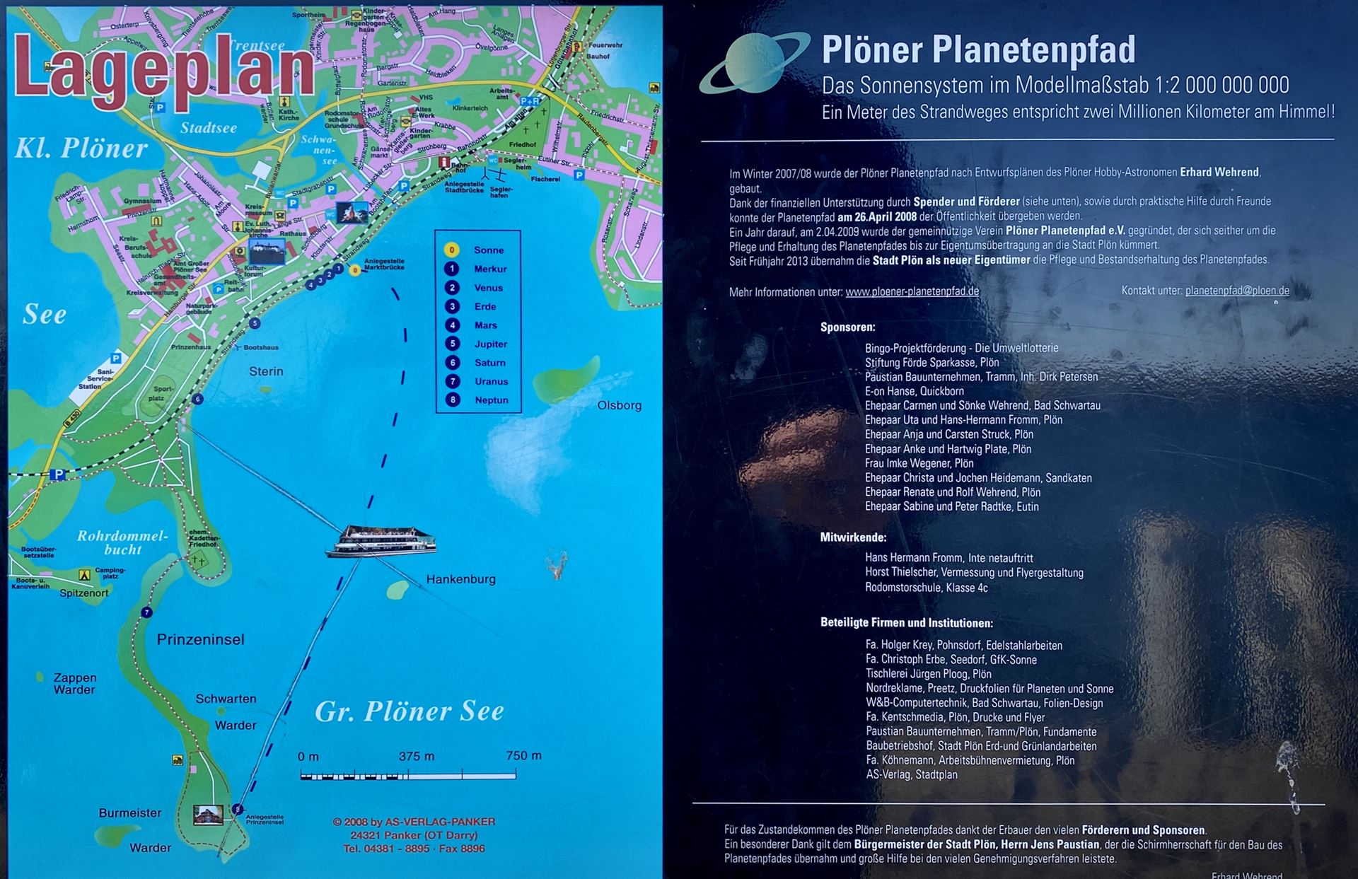Der Planetenpfad führt Euch entlang des Großen Plöner Sees und stellt ein maßstabsgetreues Modell des Sonnensystems im Maßstab 1:2 Milliarden dar. Infotafeln entlang des Weges erzählen Euch viel Wissenswertes über die einzelnen Planeten.