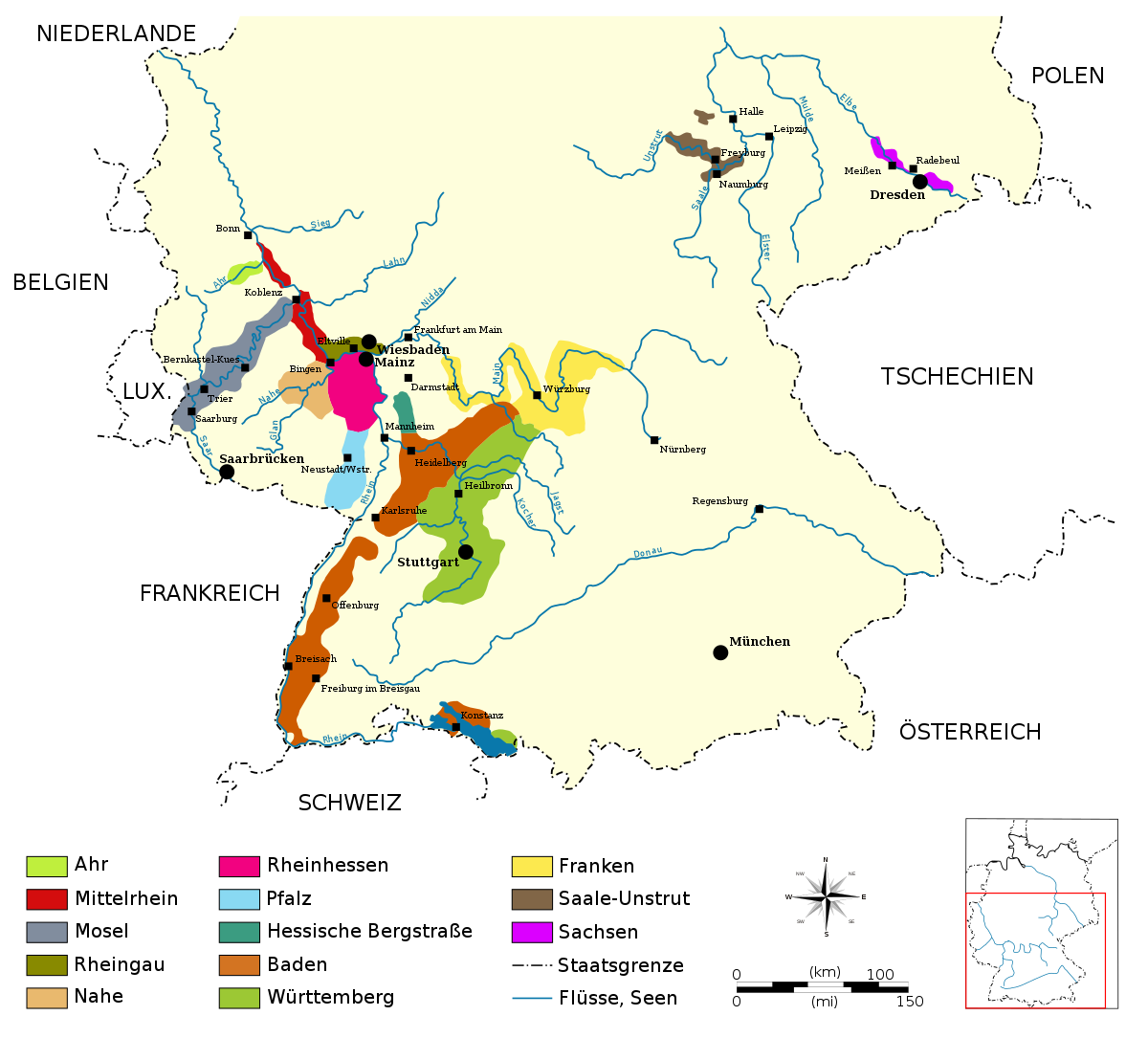 Deutschland verfügt über 13 Anbaugebiete. Mit Ausnahme von Sachsen und Saale-Unstrut konzentrieren sich diese Gebiete im Süden und Südwesten Deutschlands entlang von Rhein, Main, Mosel und Neckar sowie ihrer Nebenflüsse.